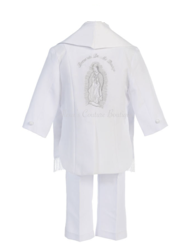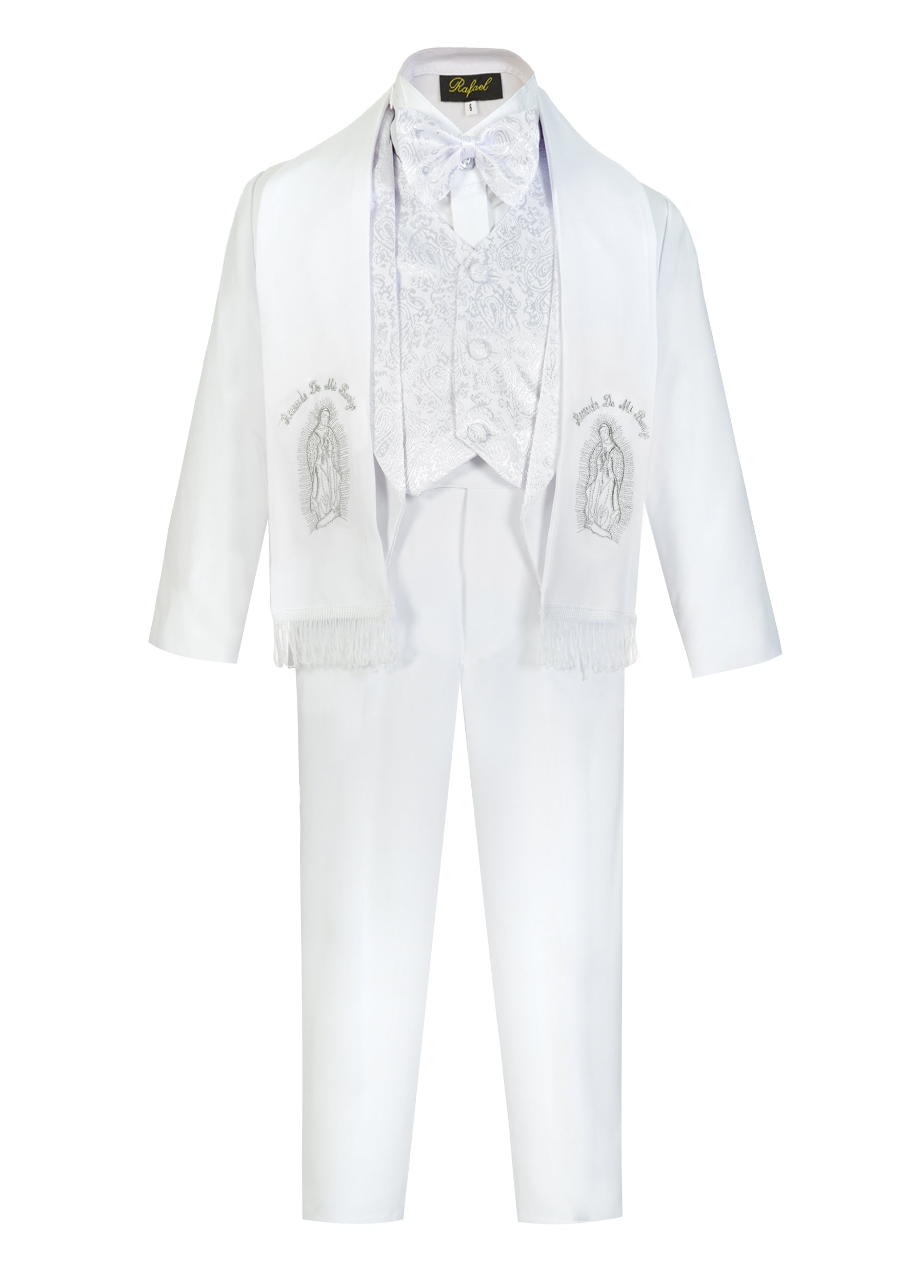 Boys 6 pcs religion formal tuxedo Maria print with bow tie and scarf comes in 2 different color sets: White/silver and white/gold