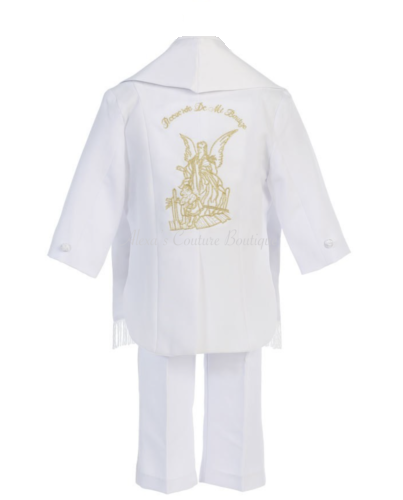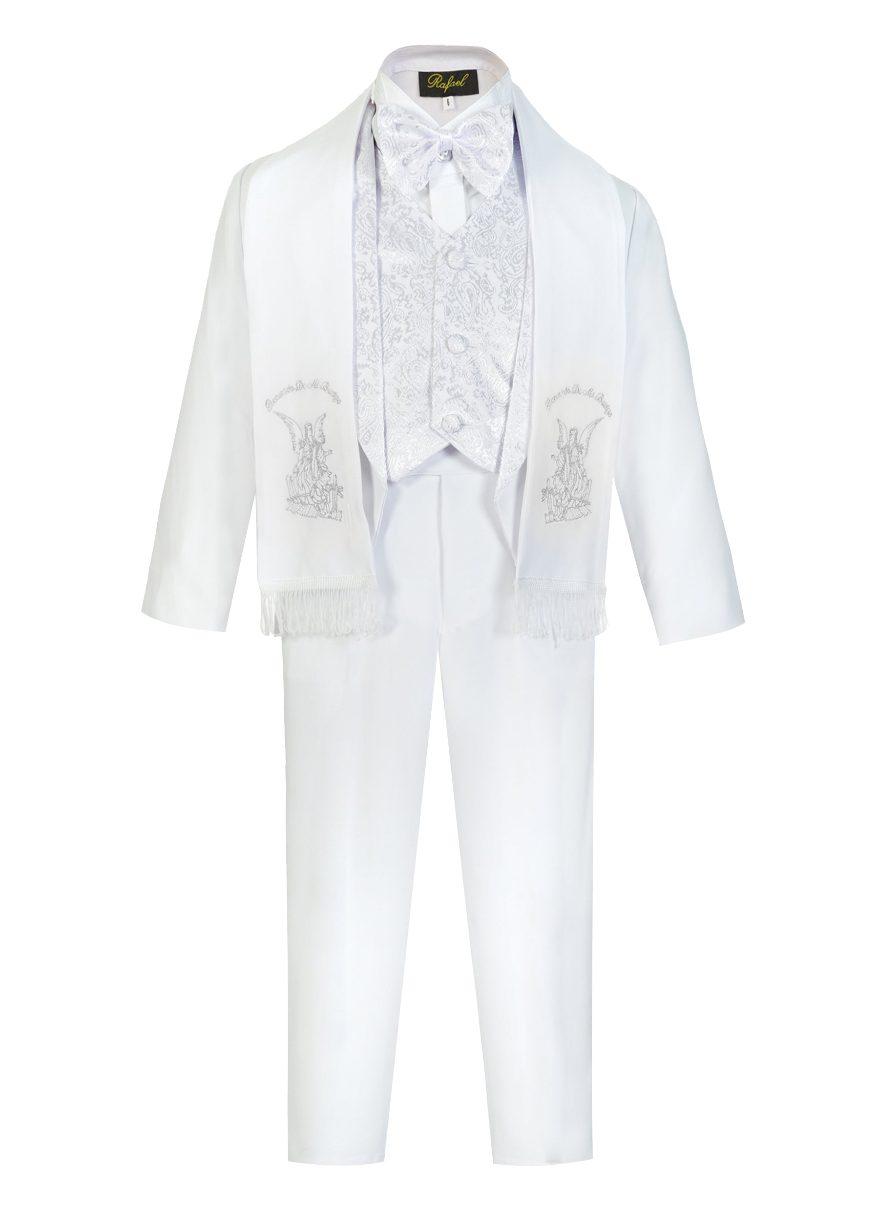 Boys 6 pcs religion formal tuxedo angel print with bow tie and scarf comes in 2 different color sets: White/silver and white/gold